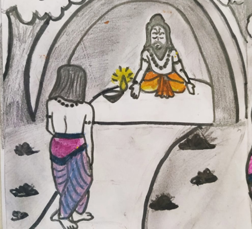 While entering the cave he saw a small light. As he moved forward even that little light got extinguished. In darkness one feels frightened, and in fear, we think of God very intensively. Thus he uttered loudly the word “Namah Shivaya” and on hearing this, the saint asked him who he was. He said that he had come to seek his grace.