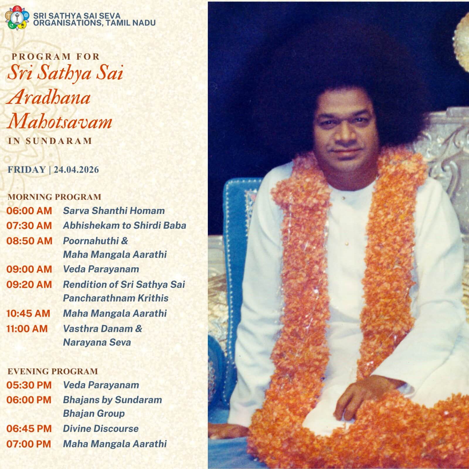 Sri Sathya Sai Aradhana Mahotsavam – on Friday 24th April